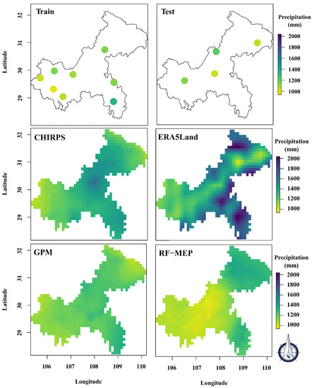 The spatial pattern distribution of average annual precipitation of ground measurements from the 12 stations (8 for train and 4 for test), the three existing gridded precipitation products (CHIRPS, ERA5-Land, and GPM), and the RF-MEP merged dataset in Chongqing during 2001–2017.