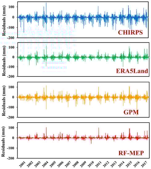The residual error in daily precipitation time series for the three existing gridded precipitation products (CHIRPS, ERA5-Land, and GPM) and the RF-MEP merged precipitation dataset at the Fengdu station.