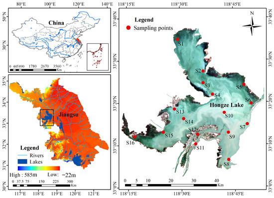 Hongze Lake (33°03′–33°40′N and 118°10′–118°52′E), one of the largest freshwater lakes in the lower reaches of the Huaihe River, is located in the western area of Jiangsu Province, China, and has a surface area of approximately 1580 km2 [27]. The bottom of Hongze Lake is flat and consists mainly of sediment and phytoplankton. As an important source of the Huaihe River and an important reservoir for the South–North Water Transfer Project, Hongze Lake plays an important role in climate regulation, ecological protection, flood and drought prevention, agricultural irrigation, and as a source of drinking water [28].