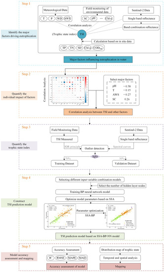 - Step 1: Data collection and collation, and identification of the main driving factors of TSI. Complex environmental factors were used to compensate for the uncertainty of remote sensing inversion.
