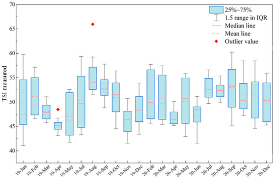 The monthly TSI distribution was calculated using in situ sample data monitoring five key indicators between January 2019 and December 2020. Each box shows the TSI between Q1 and Q3. In the boxes, the pink solid line indicates the median of TSI, the pink dotted line indicates the mean of TSI, the endpoints indicate the 1.5 IQR, and the red point indicates an abnormal value.