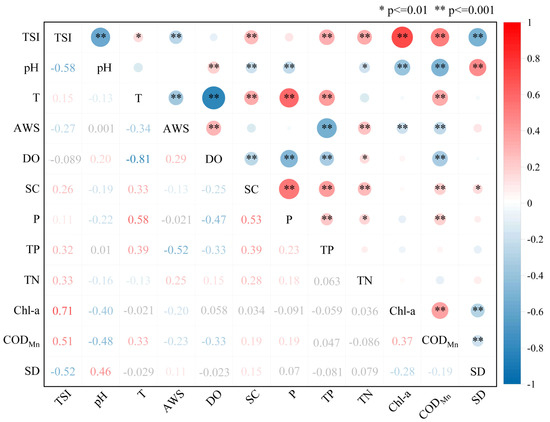 Based on several indicators collected in this study, we selected six typical meteorological and environmental factors for analysis: pH, T, AWS, DO, SC, and P. The Pearson correlation coefficients (PCC) between the TSI and these factors were calculated and the influence of these factors on the trophic state of the study area was assessed.