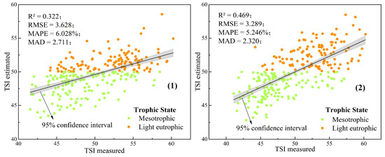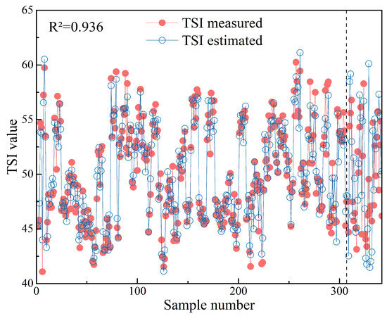 The distribution of the estimated and measured TSI when Zero-Index was used as the input to the BP-NN model is shown in Figure 7. It can be observed that the accuracy of the model improved to some degree after using the RS as input variables. The R2 has improved from 0.322 to 0.469.