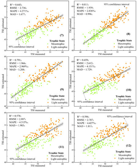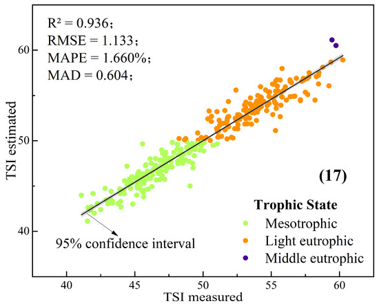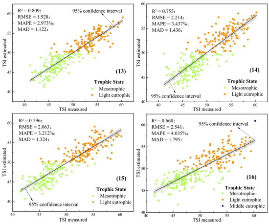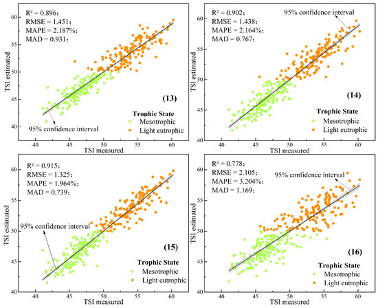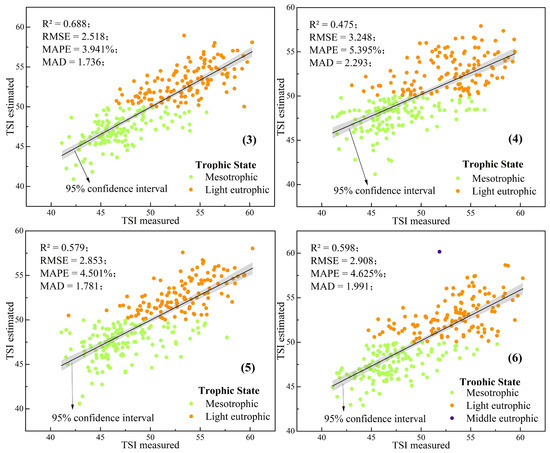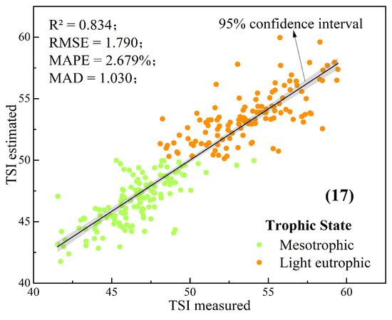 To reduce errors in the assessment of the trophic state of lakes, researchers have proposed the trophic state index (TSI) [22], which is gradually being applied in trophic state analysis and for risk prediction of algal bloom outbreaks. This index considers five indicators: Chl-a, total phosphorus (TP), total nitrogen (TN), Secchi depth (SD), and the permanganate index (CODMn) [23]. The TSI can be quickly calculated to identify and compare the trophic state of lakes according to grading criteria. Unfortunately, because the TSI involves several indicators reflecting the trophic state of water, its inversion is more difficult than with other approaches. Some recent studies have developed empirical models to investigate the direct correlation between TSI and reflectance [24] or some major water color indexes [3]. These models are simpler and more accurate, but their applicability and extrapolation performance require improvement. To overcome these difficulties, current research tends to use machine learning to develop TSI inversion algorithms [23].