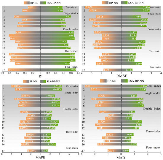 When Four-Index was used as the input, the SSA-BP-NN model achieved the highest accuracy (R2 = 0.936, RMSE = 1.133, MAPE = 1.660%, MAD = 0.604), as shown in Figure 13. Compared to the BP-NN results, the overall accuracy increased by 12.3% (Figure 11).