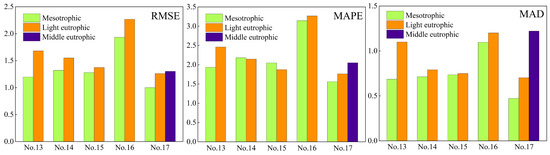 The results of Three-Index being used as the input to the SSA-BP-NN model are shown in Figure 12. In particularly, the highest accuracy (R2 = 0.915, RMSE = 1.325, MAPE = 1.964%, MAD = 0.739) was achieved when No.15 (pH&AWS&SC&RS) was used as input to the model, which met the accuracy requirements for TSI assessment. These results were significantly better than those of BP-NN models with the same input variables (Figure 10), for which the accuracy improved by 10.8%, 19.5%, 14.9%, and 17.9%, respectively.
