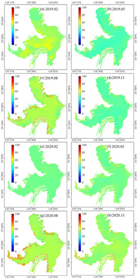 Here, using the comprehensive integrated framework, the TSI temporal and spatial distribution of Hongze Lake from 2019 to 2020 (Figure 17) was mapped by combining four key environmental factors and S-2/MSI data.
