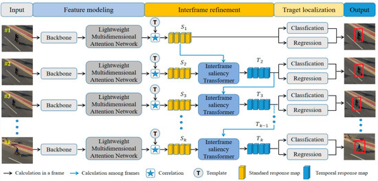The method we proposed aims to achieve maximum lightest weight for embedded deployment using a lightweight backbone, MobileNet V2. It then explicitly enhances the saliency and discriminative power of the features through a lightweight multidimensional attention network. After obtaining the response map through feature matching between the search region and the template using the correlation operator, it is fed into the interframe saliency transformer for , which fully utilizes the temporal context information. Finally, target location and state are obtained through a classification and regression network. In particular, when k = 1, it is directly input into subsequent interframe refinement and target localization.