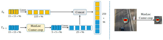 The center of the response map corresponds to the predicted center of the target by the algorithm. Through the MaxLoc center crop on the right side of Figure 4, we crop the region of greatest interest to the algorithm as focal information, centered on the maximum value of the response map, to eliminate background information around the target. The focus information is linearized and then concatenated channel-wise with the linearized focus information to obtain a response map that is fused with the focus information. When it comes to how to choose the query, key, and value for the multi-head attention mechanism, we use the temporal sequence information as the query and key and use the current response map as the value to participate in the calculation. We believe that the information in the current frame is more important than the temporal sequence information, so we use this computation method to make the network put more emphasis on the current response map and represent the feature information of the current object more accurately.