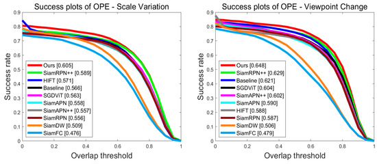 Attribute-Based Evaluation: To analyze SiamITL’s ability to cope with various complex scenarios, we conducted analyses of the six most common attributes in the UAV123 benchmark: scale variation (SV), viewpoint change (VC), partial occlusion (POC), full occlusion (FOC), out-of-view (OV), and similar objects (SOBs). The success and accuracy plots are shown in Figure 7 and Figure 8, respectively.