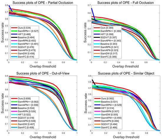 To verify the structural effectiveness of the interframe saliency transformer and lightweight multidimensional attention network proposed in this paper, Table 3 lists the success rates and four challenge-specific accuracy metrics of SiamITL and baseline with different components. With the addition of the lightweight multidimensional attention network to enhance feature saliency, the tracker’s success rate and ability to cope with various complex scenarios have exceeded the baseline. Additionally, with the inclusion of the interframe saliency transformer structure, which adds temporal sequence information to the model, SiamITL’s tracking performance and robustness have been further significantly improved.