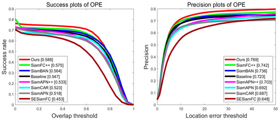 As can be seen, in scenarios where the target’s appearance changes (SV, VC), features are lost (POB, FOB, OV), or the target’s information is disturbed (SOB), our algorithm, which combines the interframe saliency transformer and lightweight multidimensional attention network, achieved significant improvements compared to baseline and outperforms existing algorithms. This indicates that the introduction of time contextual information and the explicit enhancement of feature saliency in our algorithm can effectively improve the robustness of drone-based ground tracking in complex scenarios.