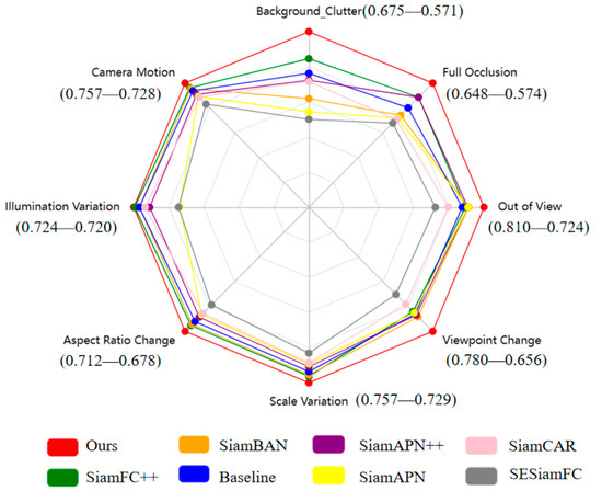 Attribute-Based Evaluation: To further demonstrate the performance of our algorithm in complex scenarios, we visually presented the accuracy comparison of various algorithms under multiple challenge attributes using a radar plot. As can be seen from Figure 10, our algorithm significantly outperforms other state-of-the-art algorithms in dealing with complex scenarios, such as background interference, occlusion, out-of-view, and viewpoint changes. This fully demonstrates that our algorithm can effectively cope with various complex scenarios during the tracking process.