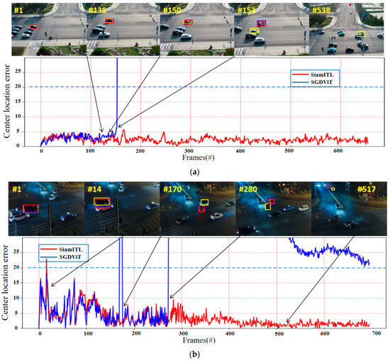 By focusing on the S0301 sequence, it can be seen that this sequence is a tracking scene in a night-time scene, and the main challenges are similar target interference and target appearance changes in low-visibility conditions. Around frame 14, due to partial overlap between the similar target and the target vehicle, the tracking results of our algorithm experience a slight accuracy fluctuation, but it quickly regains correct tracking of the target vehicle. In the subsequent tracking process, the SGDViT algorithm is affected by the interference of surrounding vehicles and experiences tracking failure, while our algorithm effectively overcomes the complex scene of similar target interference and target appearance and size changes.