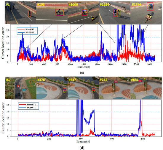 Visualization of tracking results on the UAVDT and UAV20L benchmark. The yellow frame represents SGDViT, the blue frame represents ground truth, and the red frame represents our method. The CLE below the purple dashed line (CLE < 20) is the success tracking in the test. The first frame of the sequence displays the initial state of the object. (a) S1606 subset. (b) S0301 subset. (c) Bike1 subset. (d) Car1_2 subset. The vertical coordinate. represents the Euclidean distance between the predicted box and the ground truth box, with the unit being the number of pixel points.