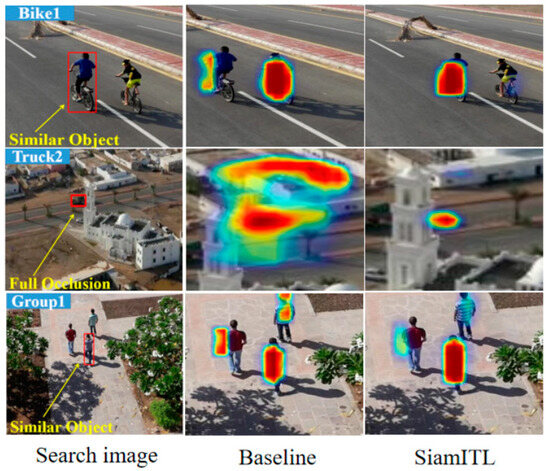 As shown in Figure 12, in the bike1 sequence, due to the interference of nearby similar targets, the attention of the baseline network is completely shifted to the interfering target, while the improved algorithm SiamITL can stably perceive the target. In the truck 2 sequence, it can be seen that when the truck is occluded, the attention of the baseline is diffused to the entire surrounding area, while the proposed algorithm can still accurately capture the truck’s feature information. In the group 1 sequence, despite interference from nearby pedestrians, the proposed algorithm exhibits a slight shift in attention, while the baseline’s attention is focused on each interfering target, burying hidden dangers for the accuracy and robustness of the algorithm.