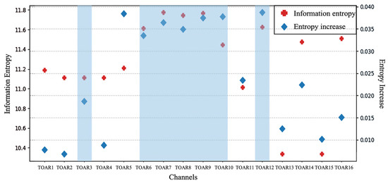 The information gain and entropy for each channel were computed (Figure 2). Based on the selection of a high-resolution channel combination (TOAR6, TOAR7, TOAR8, TOAR9, TOAR10, TOAR12), choosing a few, appropriate features can both avoid overfitting and increase model interpretation. TOAR3 has higher score in the visible channels to ensure that the information from the visible, near-infrared, and infrared channels were all used as modeling variables. However, TOAR5 maintains less information entropy compared to other near-infrared channels (TOAR6 and TOAR7), so it was not taken into consideration. Ultimately, TOAR3, TOAR6, TOAR7, TOAR8, TOAR9, TOAR10, and TOAR12 were selected as the seven channels to participate in the modeling process.