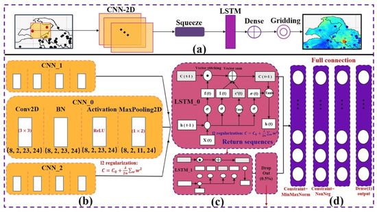 The proposed network architecture. (a) General overview of the end-to-end deep neural network model 2DCNN-LSTM. (b) Consists of three portions of CNN receiving four-dimensional tensors with spatial and temporal information as inputs, and each portion consists of a two-dimensional convolutional layer used to extract the spatial features: a Batch Normalization layer, an activation layer, and a pooling layer. (c) Two connected LSTM layers of cell states from t-1 to t: a dropout layer is inserted between the LSTMs to randomly inactivate neurons to suppress overfitting. (d) Four Dense layers that extract feature associations so that they are mapped onto the output space, with the first two Dense layers imposing a MinMaxNorm constraint and a NonNeg constraint, respectively.