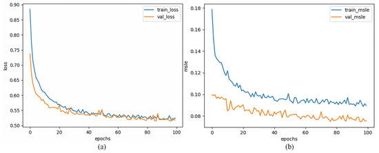 Loss falling curves: (a) Loss curves: blue line: training error; orange line: validation error. (b) Mean square logarithmic error (MSLE) curves: blue line: training mean square logarithmic error; orange line: validation mean square logarithmic error.