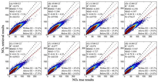 The 8 h daytime 10-fold cross-validation results based on 2DCNN-LSTM (hourly cross-validation results (A–H)). The black dashed line represents the expected error line, the light dashed line represents the 1:1 line, and the red solid line represents the linear regression fit line; N represents the sample size obtained each time.