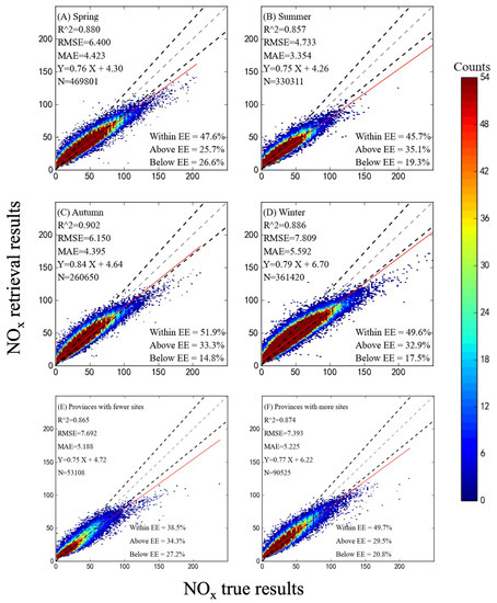 To validate the accuracy of the model, the 8 h daytime (Figure 5) and the seasonal results (Figure 6A–D) were validated for further analysis. The x-axis represents the observed hourly NO2 concentrations, while the y-axis represents the near-surface concentration results obtained from the 2DCNN-LSTM model. The regression evaluation indicators, including R2, RMSE, and MAE, were used to assess the fitting effect and accuracy of the model [30]. We clustered based on the density of observation stations in various provinces in China (Figure 6E,F) to form low-density measurement regions (Tibet, Ningxia, Qinghai, and Xinjiang) and high-density measurement regions (Jiangsu, Zhejiang, Beijing, and Guangdong), and model performance was assessed. Preliminary findings suggested that differences in station density directly impacted sample size, thus affecting model estimation results. Higher-density areas with larger training sets facilitated the algorithm’s ability to identify correct patterns and trends, thereby improving accuracy as the training set size increases. The R2 of low monitoring station density regions was lower than for high density. This comparison demonstrated the direct impact of station density differences on the model’s estimation performance, but this difference was less than 0.1, indicating that it did not affect the main conclusions of the model.