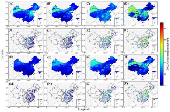 Spatial distribution of NO2 retrievals (A–H) versus spatial distribution of stations (I–P) for each season from 2018 to 2019 (unit: .
