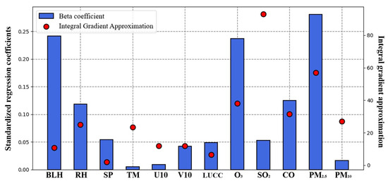 Model predictability measures for the feature variables: left axis: standardized regression coefficients; right axis: approximation of the integral gradient. The blue bars indicate the corresponding beta coefficients of each factor, and red dots indicate the corresponding integral gradient values of each factor.