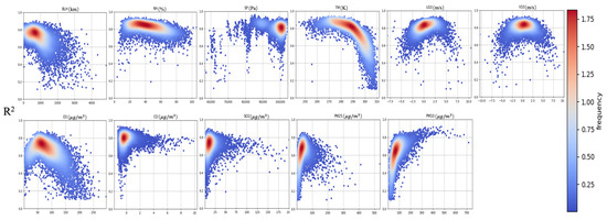 PAHs and BC in PM2.5 and PM10 are characterized by their composition, distribution, sources, and health risks [36], being potentially affected by regulatory actions [37]. As mentioned earlier, other pollutants and meteorological conditions can have an impact on pollutant concentrations. In order to figure out the influence of studied parameters on the model, Figure 10 displays the variation trend of the R2 concerning different feature factors, offering insight into how each parameter’s changes influence spatiotemporal patterns. The results reveal that the R2 of the estimated NO2 concentration varies with fluctuations in meteorological elements and other pollutant concentrations. In general, various factors influenced the R2 of the model. R2 increased with SP, U10, and PM10 and decreased with BLH, RH, and TM. The variation in R2 with V10 was less apparent, and other factors exhibited a trend of initially increasing to a maximum before decreasing.