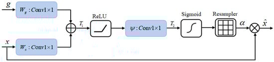 - Converter: It contains 5 AGs with skip connections. The AG model is shown in Figure 1, and its implementation steps are as follows: (a) Convolution is performed on the input feature maps g and x. Then, add the two feature maps to obtain the new feature map. To achieve the purpose of enhancing the feature area; (b) To create the feature map , the feature map is first processed by the ReLU activation function and then put through a convolution operation; (c) The weight map (taking values in the range [0, 1]) is obtained after the sigmoid activation function is applied to , the background feature area, which tends to 1, and the anomalous feature area, which tends to 0; (d) Resample and add it to the feature map x to obtain to enhance the background features and weaken abnormal features [28]. The coarse feature map generated by Block 1 or Block 4 and the fine feature map extracted at multi-scales are sampled, and the complementary information is extracted and fused by AG input before finally being merged into the next Block 6 by skip connection.