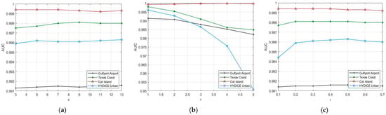 - Window size c: A line chart of the AUC values with parameter c is shown in Figure 8a. The AUC value of Gulfport Airport fluctuates up and down in the general trend and reaches its peak when c = 13, so the Gulfport Airport window size c is set to 13. For Texas Coast, the general trend of AUC value is increasing first, then decreasing to reach the peak at c = 9. Therefore, the Texas Coast window size c is set to 9. For Cat Island, the AUC value is constant from window sizes 3–9 and decreasing from c = 9, so the Cat Island window size c is set to 9. For HYDICE Urban, the AUC value tends to increase all the time, so the HYDICE Urban window size c is set to 13. To sum up, the parameters c for the above four datasets are set to 13, 9, 9, and 13, respectively. In the order given in Section 4.1.