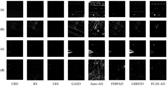 Detection results of different algorithms. (a) Gulfport Airport; (b) Texas Coast; (c) Cat Island; (d) HYDICE Urban.