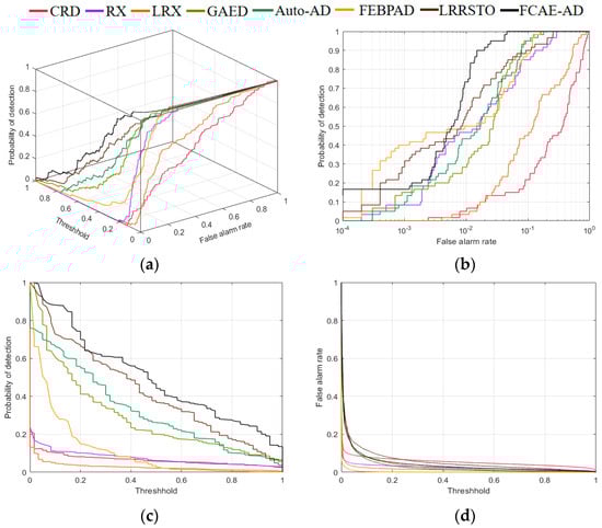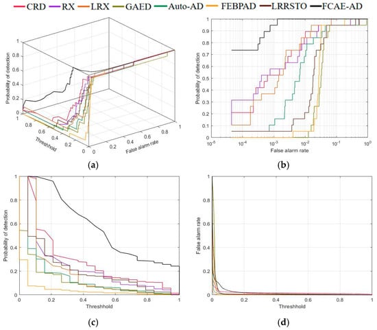 Performance comparison of different algorithms on Gulfport Airport. (a) 3-D ROC curves; (b) 2-D ROC curves ; (c) 2-D ROC curves ; (d) 2-D ROC curves .