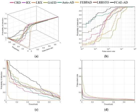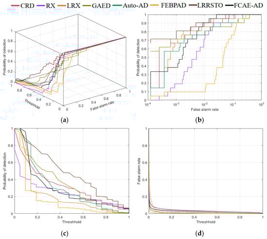 The 3D-ROC curve, 2D-ROC curves, and corresponding AUC values of several algorithms in the HYDICE Urban experimental dataset are displayed in Figure 13 and Table 5, respectively. As demonstrated by Figure 13a,b, the 3D-ROC curve and the 2D-ROC curve of the FCAE-AD algorithm are superior to other comparison algorithms. The 2D-ROC curves of and are shown in Figure 13c,d. As can be seen from the table, the value in this paper is the highest, 0.9963. The best values are shown in bold. Although the values of other , , , , , , and indexes in this paper are not optimal, some competitive results have been obtained.