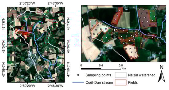 The study area is an agricultural land covering ca. 1.5 km2 in the northwestern section (48°0′40′′N, 2°50′40′′W) of the Naizin watershed (western France). The fields studied were located on both sides of a small tributary of the Coët-Dan stream with a moderate slope (<5%). Fields in the northern part have the steepest slopes, with slopes of between 3% and 5%, while those in the southern part are less than 2%. The climate is temperate, with mean annual rainfall of ca. 909 mm. Agriculture is mainly intensive, with cereals, maize, and grassland as the main land uses in crop rotations. The soils are developed on a silty substrate derived from weathered schists and Quaternary aeolian deposits. The dominant soil types are Luvic Cambisols and Haplic Albeluvisols of silty texture [,,].