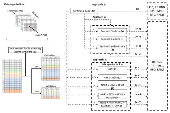 The present study aimed to increase the accuracy of SOC content predictions using two complementary mechanisms: (i) Enriching the information considered by combining remote sensing time series and laboratory spectral measurements; (ii) Improving model accuracy using machine-learning algorithms. To this end, we used Sentinel-2 remote sensing data of bare soil and combined them with Sentinel-1 SAR-derived data and indices derived from Vis-NIR laboratory spectra to predict SOC content in an agricultural study area. We also compared the performance of PLS regression, RF, and DNN models in predicting SOC content.
