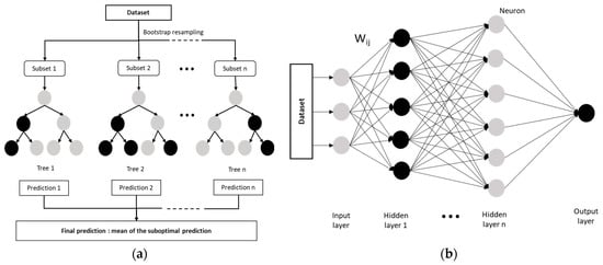 Schematic diagram: (a) The Random Forest model structure (adapted from Song et al. (2022) []); (b) The DNN model architecture (adapted from Liu et al. (2017) []).