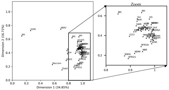 The first factorial plane of the multiple factor analysis (MFA), showing the correlation of the Sentinel-2 indices with the MFA dimensions with a zoom on the condensed part. See Table 2 for definitions of the spectral indices.