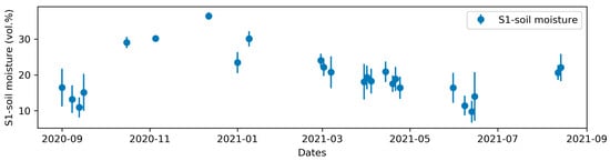 S1-soil moisture varied more than the S1-indices (Figure 7). The mean S1-soil moisture varied from 9.8% to36.5%, with standard deviations of 0.8–6.8% that were lowest on the dates with the highest soil moisture (≥30%).