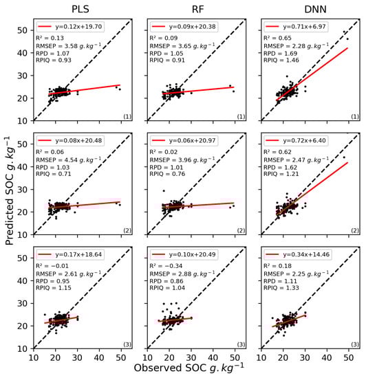 Scatterplots of measured vs. predicted soil organic carbon (SOC) content for the validation dataset using Sentinel-2 bands and the partial least squares (PLS), random forest (RF), or deep neural network (DNN) algorithms for the three iterations ((1), (2), and (3)). R2: coefficient of determination, RMSEP: root mean square error of prediction, RPD: ratio of performance to deviation, RPIQ: ratio of performance to the interquartile distance.