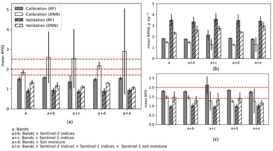 Mean performance of the three iterations during model calibration and validation using the random forest (RF) and deep neural network (DNN) algorithms when using Sentinel-2 indices, Sentinel-1 indices, and Sentinel-1 soil moisture: (a) Ratio of performance to the interquartile (RPIQ); (b) Root mean square error (RMSE); (c) Ratio of performance to deviation (RPD). Error bars indicate 1 standard deviation. Horizontal red lines indicate performance thresholds (see Section 2.6.4).
