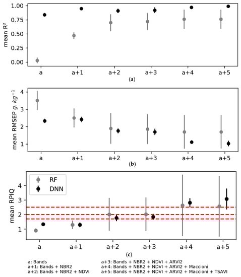 Mean performance of the three iterations of model validation using the random forest (RF) and deep neural network (DNN) algorithms when adding laboratory spectral indices incrementally in the order of decreasing correlation with soil organic carbon content: (a) The coefficient of determination R2; (b) The root mean square error of validation (RMSEP); (c) The ratio of performance to the interquartile distance (RPIQ). Error bars indicate 1 standard deviation. Horizontal red lines indicate performance thresholds (see Section 2.6.4). See Table 2 for definitions of the spectral indices.