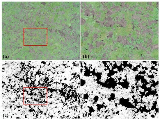 Processing of UAV actual aerial image. (a) UAV aerial photography to obtain the coverage image; (b) the red box of (a); (c)the EGI segmentation results of the aerial image; (d) the EGI segmentation results of the red box.