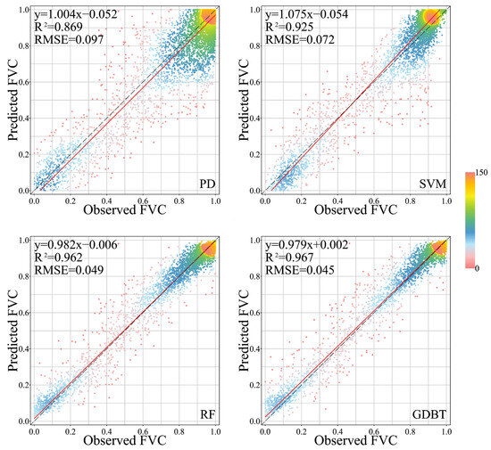 The PD model is simple, better interpretable, and can quickly simulate the dynamic change of FVC over long time series. However, the selection of endmembers is critical to the success of the PD model [42]. At present, it is a common method to obtain pure vegetation and non-vegetation endmembers by counting the pixel values of the vegetation index and then setting confidence intervals. Therefore, our study used confidence intervals to extract pure vegetation and non-vegetation endmembers from remote sensing images. Our study results show that the accuracy of the PD model is lower than that of the machine learning algorithms, which is similar to the previous research results on the Tibetan Plateau [3,12]. Ge et al. [12] found that the MODIS-based PD model is not applicable to estimate FVC in the Tibetan Plateau region because of the limitation of insufficiently measured pure endmember data matched with image elements. In addition, Lehnert L W et al. [3] found that due to the special situation of the Qinghai-Tibet Plateau, such as high wind speed and bad weather, it is difficult to obtain high-quality field measured spectral data, resulting in a large difference between the measured data and the satellite remote sensing spectral information, thus affecting the training dataset. Therefore, it is difficult to obtain high quality pure vegetation and non-vegetation endmembers in the Tibetan Plateau region, which may be the reason for the low accuracy of PD in the SRYR.