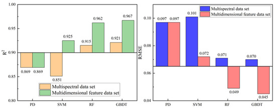Evaluation of inversion accuracy based on multispectral reflectance dataset by PD model, SVM model, RF model and GBDT model.