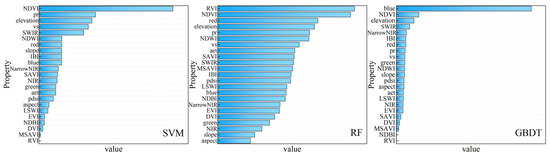 The results of the evaluation of the importance of each feature factor in the algorithms show that (Figure 8): In the GBDT model, blue band, NDVI, and elevation are the first three most important driving factors, and the importance of SWIR band and Narrow NIR band driving factors decreases successively. In the RF model, RVI, NDVI, and the red band are the three most important driving factors, and the importance of elevation and precipitation decreases successively. In the SVM model, NDVI, precipitation, and elevation are the top three important factors, followed by wind speed and the SWIR band, and their importance decreases in turn. The top five most important features in these three models all have NDVI and elevation features, indicating that in the algorithm model of this study, these two factors have a vital impact on the accuracy of the inversion results.