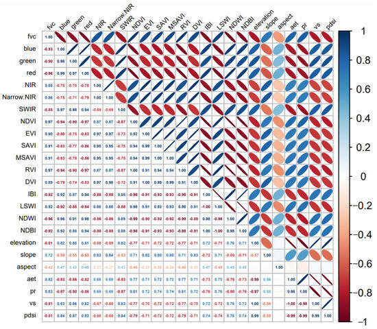 The results of the correlation analysis of multiple characterization factors with FVC show that (Figure 9): Within the spectral band, the red band, the blue band, and the green band have an extremely strong correlation with FVC, and the correlations decreased successively, while the NIR band, the Narrow NIR band, and the SWIR have a strong correlation with FVC, and the blue band, the green band, the red band, and the SWIR band have a negative correlation with FVC, whereas the NIR band and Narrow NIR band have a positive correlation with FVC. Among the indices, NDVI, RVI, and NDWI were highly extremely strongly correlated with FVC, while IBI, LSWI, NDBI, MSAVI, SAVI, and EVI were all extremely strongly correlated with FVC, but the correlations decreased successively. DVI is strong correlation with FVC. NDVI, EVI, SAVI, MSAVI, RVI, DVI, LSWI were positively correlated with FVC, while IBI, NDWI, and NDBI were negatively correlated with FVC. Among topographic and climate factors, elevation, slope, aet, pr, vs, pdsi are strongly correlated with FVC, while aspect is moderately correlated with FVC. Among them, aet, pr and slope are positively correlated with FVC. vs, pdsi, elevation, and aspect are negatively correlated with FVC.