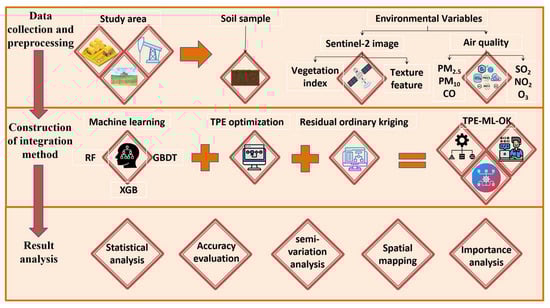 However, whether the integration of the TPE-based ML model and geostatistical model can significantly improve the spatial prediction accuracy and explain the relationship between environmental variables and soil NH3 flux is still unclear (i.e., nonlinear and linear coupling characteristics). Therefore, to overcome the limitations of the hyperparameter adjustment and spatial autocorrelation neglect of ML modeling, the objective of this study is to demonstrate the increased predicted model performance using TPE–ML–OK-based models with Sentinel-2 remote sensing image and air quality data, which involves establishing ML models, determining the optimal hyperparameters using the TPE algorithm, building a residual ordinary kriging model, and revealing the relationships between key variables and soil NH3 flux via explainable analysis. The environment variables (i.e., Sentinel-2 remote sensing image and air quality data) related to soil NH3 were collected first. Then, the tree-structured Parzen estimator (TPE) search was applied to find the optimal hyperparameters of the gradient boosting decision tree (GBDT), random forest (RF), and extreme gradient boosting (XGB) models, and the residual ordinary kriging model was used to further predict and mapping the soil NH3 flux. Finally, the relationships between environmental variables and soil NH3 were evaluated using the SHapley additive explanation (SHAP) method.