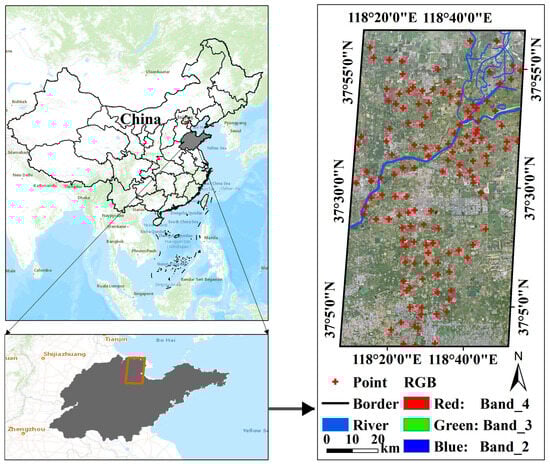 The study area is situated in the Yellow River Delta (YRD), East China (36°55′–38°10′N, 118°07′–119°10′E). It has a temperate continental monsoon climate, and the terrain inclines from southwest to northeast along the Yellow River (Figure 2). Soil types are divided into five categories: cinnamon soil, Shajiang black soil, fluvo-aquic soil, saline soil, and paddy soil. Based on the statistical yearbook of Dongying in 2020, the average temperature in the study area is 14.1 °C, the annual precipitation is 665.3 mm, and the annual sunshine hours are 2998.5 h. The study area mainly contains oil, natural gas, oil shale, and many other mineral resources, which is the main production area of the Shengli Oilfield. However, the soil pollution caused by oilfield development in this area indirectly affects the survival rate of soil microorganisms and, thus, the absorption, transformation, and utilization of NH3 by some soil microorganisms, which changes the NH3 content in the soil. Spatial prediction of soil NH3 is of great significance in improving microclimate change, air pollution, and nitrogen loss from farmland in the study area.