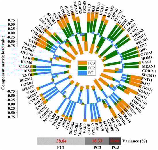 Texture features can reflect additional information, such as hue changes and attributes of remote sensing images, and have been widely used in the extraction or classification of ground object information [,,]. For example, many studies have used the GLCM method to calculate the relative frequency between the pixel brightness values of remote sensing images to obtain spatial information gain, which effectively improves the interpretation and classification accuracy of ground objects [,,]. Based on the 11 bands of the preprocessed Sentinel-2 L2A image, the texture features were also calculated and analyzed using filter/co-occurrence measures in ENVI 5.3 software. A total of 88 texture features were obtained, including eight transformations: entropy (ENT), correlation (CORR), mean (MEAN), homogeneity (HOM), contrast (CTRA), dissimilarity (DIS), angular second moment (SECM), and variance (VAR). In order to simplify the variable dimension, the first three principal components were obtained using principal component analysis (PCA) in ENVI 5.3 software, and the total variance contribution rate that can be explained is 65.83%. The features with high load values of PC1, PC2, and PC3 were mainly concentrated in band 6–band 9; band 1–band 4; and band 5, band 10, and band 11 after texture transformation (Figure 3). These principal components (PC1–PC3) representing image texture features can reflect soil physical information such as spatial information (i.e., pattern, shape, size, etc.), geometric morphology, texture, and coverage on the soil surface, and have important implications for the basic soil conditions of NH3 emissions.