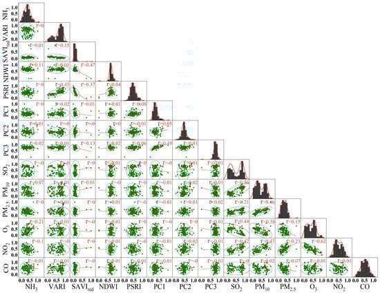 Figure 4 shows the normalized numerical distribution of NH3 flux in soil and auxiliary variables. The soil NH3 fluxes are concentrated in the median area, and the data structure is normally distributed. PSRI, PC1, and PC2 also showed significant normal distribution. However, the values of other variables showed skewed or bimodal distribution. There were significantly nonlinear characteristics among different environmental variables. The linear correlation between similar variables was strong, the positive linear correlation between vegetation index factors (i.e., SAVIred and NDWI, VARI and PSRI, and SAVIred and PSRI) was high (r > 0.2), the negative linear correlation between soil texture factors (PC3 and PC1) was strong (r = 0.39), and there was a high correlation between air quality variables. Obviously, there was a positive linear correlation between soil NH3 flux and O3 (r = 0.21) and a weak linear correlation with other variables. The above correlation analysis results show complex fitting characteristics between soil NH3 flux and environmental variables.